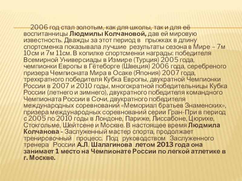 год стал золотым, как для школы, так и для её воспитанницы Людмилы Колчановой, дав ей мировую известность. Дважды за этот период в прыжках в длину спортсменка показывала лучшие результаты сезона в Мире – 7м 10см и 7м 11см. В копилке спортсменки награды: победителя Всемирной Универсиады в Измире (Турция) 2005 года, чемпионки Европы в Гётеборге (Швеция) 2006 года, серебреного призера Чемпионата Мира в Осаке (Япония) 2007 года, трехкратного победителя Кубка Европы, двукратной Чемпионки России в 2007 и 2010 годы, многократной победительницы Кубка России (летнего и зимнего), двукратного победителя командного Чемпионата России в Сочи, двукратного победителя международных соревнований «Мемориал братьев Знаменских», призера международных соревнований серии Гран-При в период с 2005 по 2010 годы в Лондоне, Париже, Лиссабоне, Цюрихе, Стокгольме, Шейтсене и Москве. В настоящее время Людмила Колчанова - Заслуженный мастер спорта, продолжает тренировочный процесс. Под руководством Заслуженного тренера России А.Л. Шалагинова летом 2013 года она занимает 1 место на Чемпионате России по легкой атлетике в г. Москве.