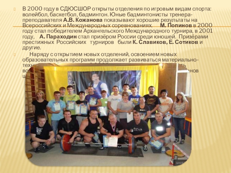 Слайд 10В 2000 году в СДЮСШОР открыты отделения по игровым видам спорта: