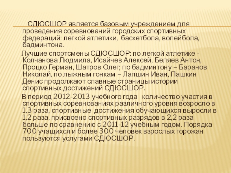 Лучшие спортсмены СДЮСШОР: по легкой атлетике - Колчанова Людмила, Исайчев Алексей, Беляев Антон, Процко Герман, Шатров Олег; по бадминтону – Баранов Николай, по лыжным гонкам – Лапшин Иван, Пашкин Денис продолжают славные страницы истории спортивных достижений СДЮСШОР.