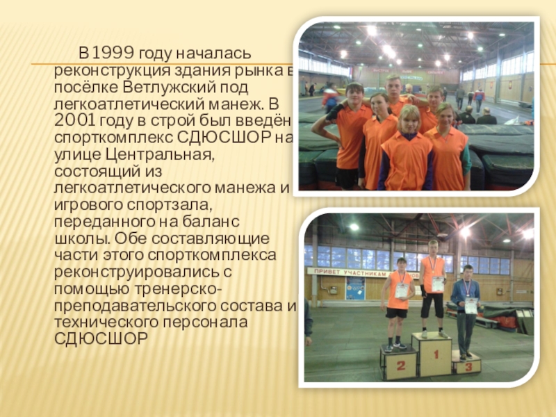 здания рынка в посёлке Ветлужский под легкоатлетический манеж. В 2001 году в строй был введён спорткомплекс СДЮСШОР на улице Центральная, состоящий из легкоатлетического манежа и игрового спортзала, переданного на баланс школы. Обе составляющие части этого спорткомплекса реконструировались с помощью тренерско-преподавательского состава и технического персонала СДЮСШОР