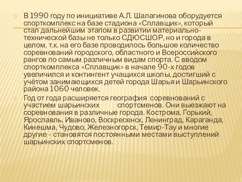 Слайд 5В 1990 году по инициативе А.Л. Шалагинова оборудуется спорткомплекс на базе