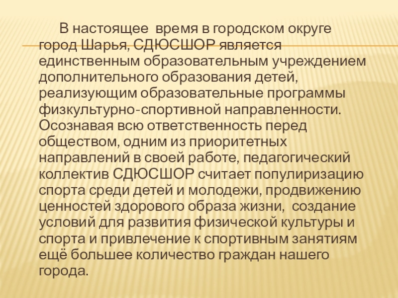 округе город Шарья, СДЮСШОР является единственным образовательным учреждением дополнительного образования детей, реализующим образовательные программы физкультурно-спортивной направленности. Осознавая всю ответственность перед обществом, одним из приоритетных направлений в своей работе, педагогический коллектив СДЮСШОР считает популиризацию спорта среди детей и молодежи, продвижению ценностей здорового образа жизни, создание условий для развития физической культуры и спорта и привлечение к спортивным занятиям ещё большее количество граждан нашего города.