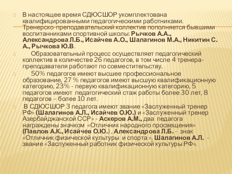 Слайд 16В настоящее время СДЮСШОР укомплектована квалифицированными педагогическими работниками. Тренерско-преподавательский коллектив пополняется