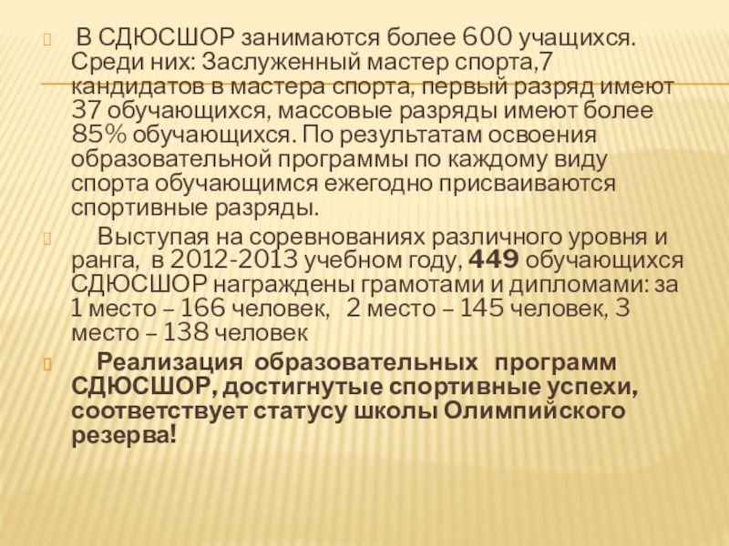 Реализация образовательных программ СДЮСШОР, достигнутые спортивные успехи, соответствует статусу школы Олимпийского резерва!