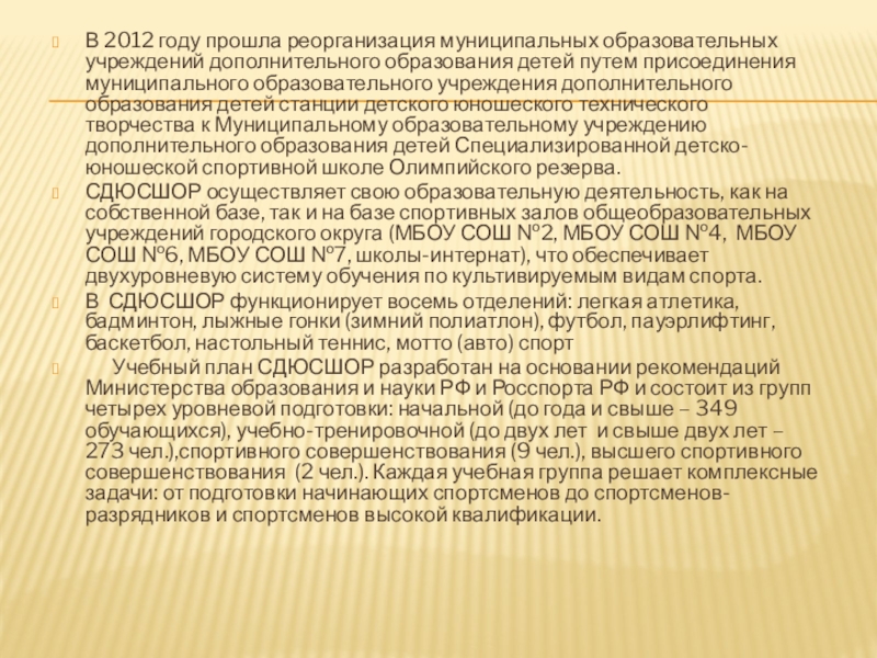 Слайд 15В 2012 году прошла реорганизация муниципальных образовательных учреждений дополнительного образования детей