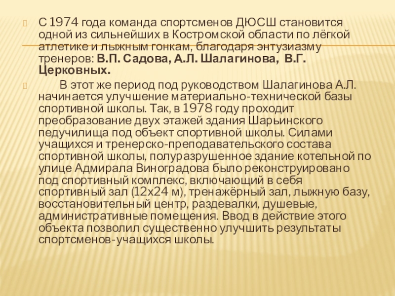 Костромской области по лёгкой атлетике и лыжным гонкам, благодаря энтузиазму тренеров: В.П. Садова, А.Л. Шалагинова, В.Г. Церковных.