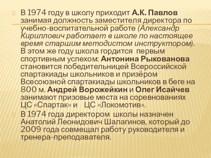 Слайд 3В 1974 году в школу приходит А.К. Павлов занимая должность заместителя