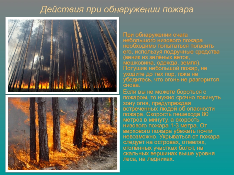 Если вы не можете бороться с пожаром, то нужно срочно покинуть зону огня, предупреждая встреченных людей об опасности пожара. Скорость пешехода 80 метров в минуту, а скорость низового пожара 1-3 метра. От верхового пожара убежать почти невозможно. Укрываться от пожара следует на островах, отмелях, оголённых участках болот, на скальных вершинах выше уровня леса, на ледниках.