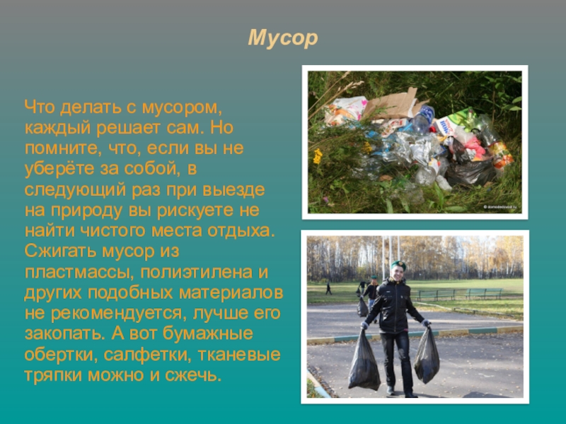 вы не уберёте за собой, в следующий раз при выезде на природу вы рискуете не найти чистого места отдыха. Сжигать мусор из пластмассы, полиэтилена и других подобных материалов не рекомендуется, лучше его закопать. А вот бумажные обертки, салфетки, тканевые тряпки можно и сжечь.