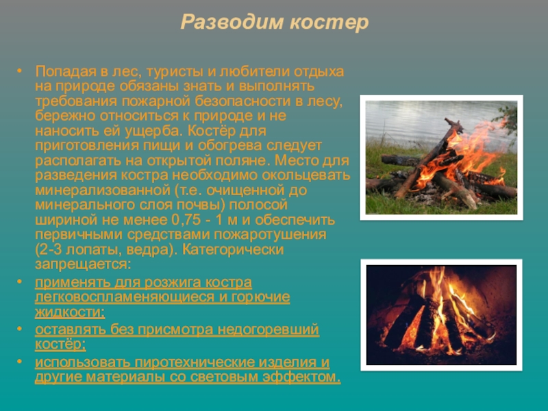 обязаны знать и выполнять требования пожарной безопасности в лесу, бережно относиться к природе и не наносить ей ущерба. Костёр для приготовления пищи и обогрева следует располагать на открытой поляне. Место для разведения костра необходимо окольцевать минерализованной (т.е. очищенной до минерального слоя почвы) полосой шириной не менее 0,75 - 1 м и обеспечить первичными средствами пожаротушения (2-3 лопаты, ведра). Категорически запрещается: