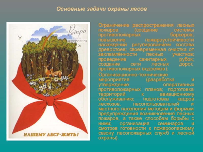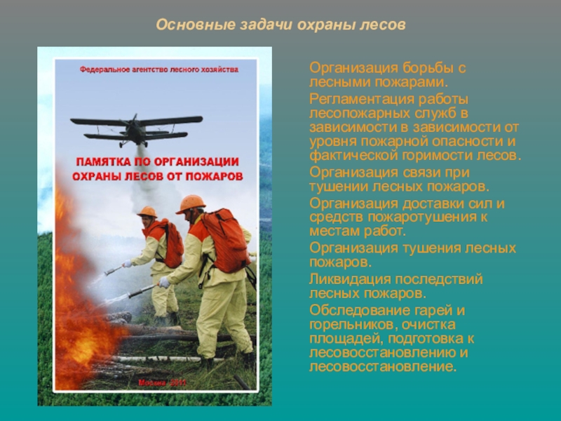 Слайд 7Охрана лесов от пожаров включает комплекс организационных, технических, правовых и других