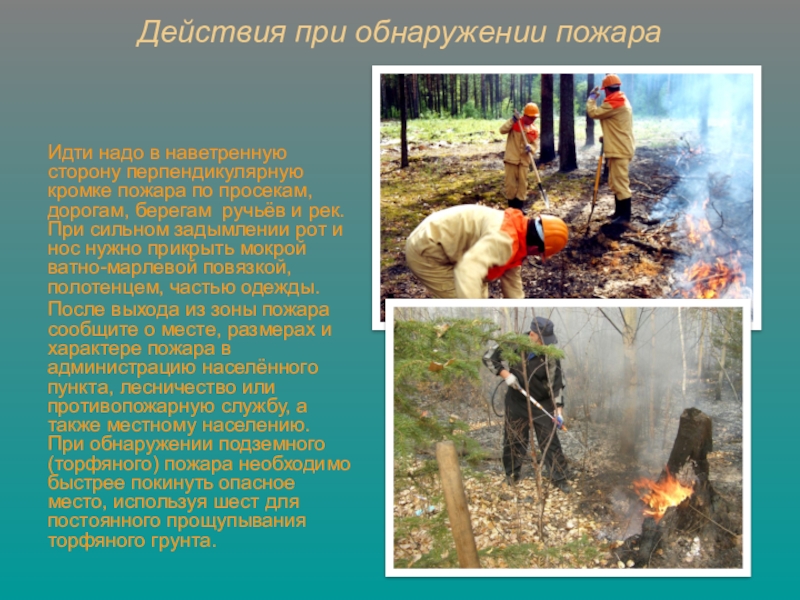 После выхода из зоны пожара сообщите о месте, размерах и характере пожара в администрацию населённого пункта, лесничество или противопожарную службу, а также местному населению. При обнаружении подземного (торфяного) пожара необходимо быстрее покинуть опасное место, используя шест для постоянного прощупывания торфяного грунта.
