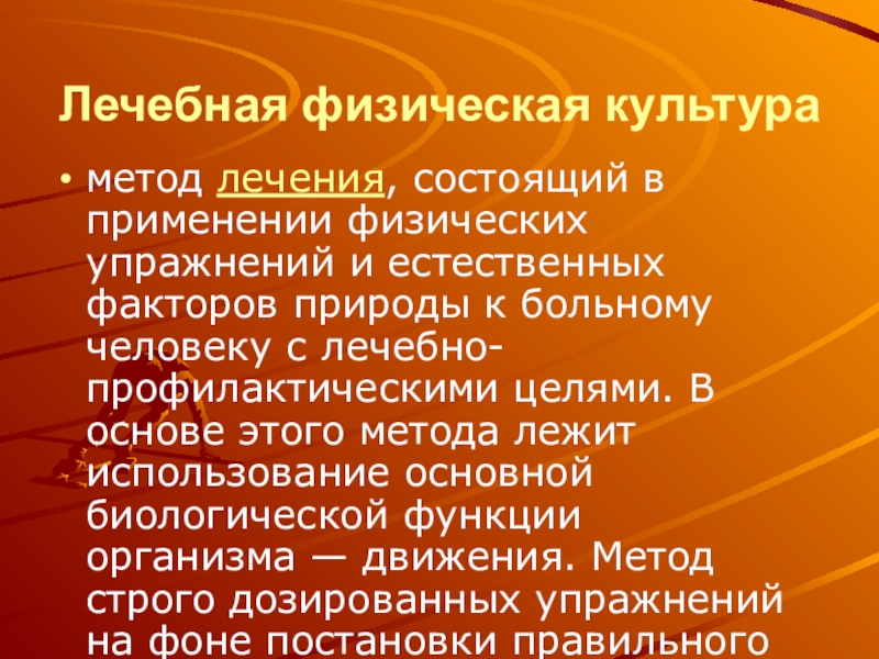 Лечебная физическая культура метод лечения, состоящий в применении физических упражнений и естественных факторов природы к больному человеку с лечебно-профилактическими целями. В основе этого метода лежит использование основной биологической функции организма — движения. Метод строго дозированных упражнений на