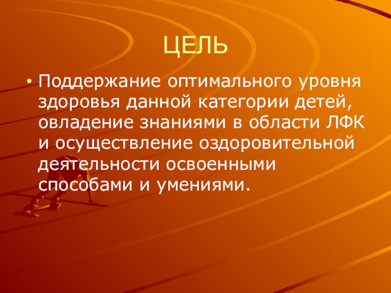 ЦЕЛЬПоддержание оптимального уровня здоровья данной категории детей, овладение знаниями в области ЛФК и осуществление оздоровительной деятельности освоенными