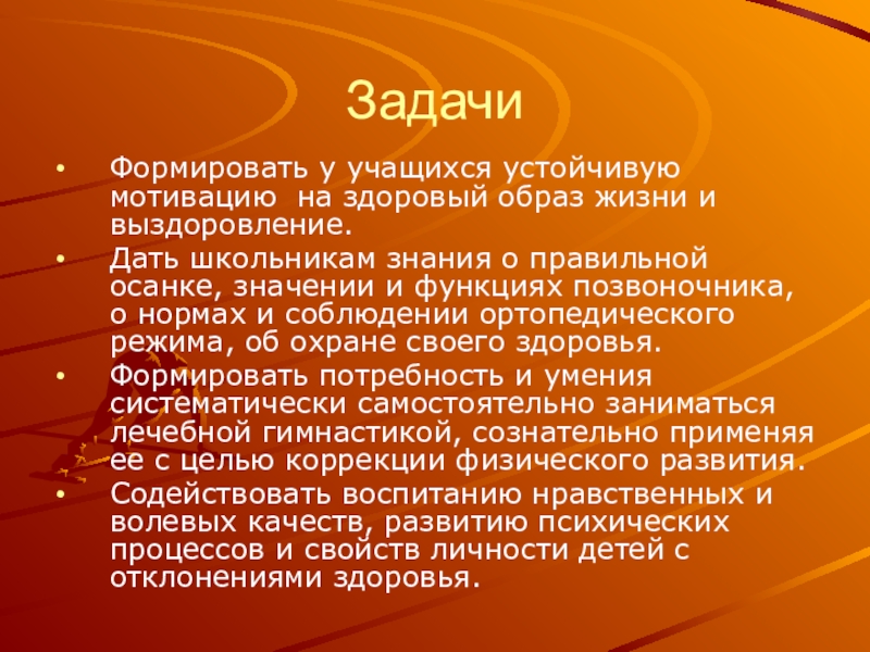 ЗадачиФормировать у учащихся устойчивую мотивацию на здоровый образ жизни и выздоровление.Дать школьникам знания о правильной осанке, значении