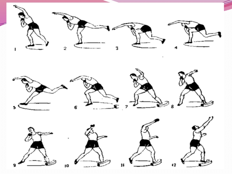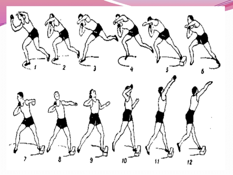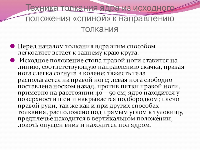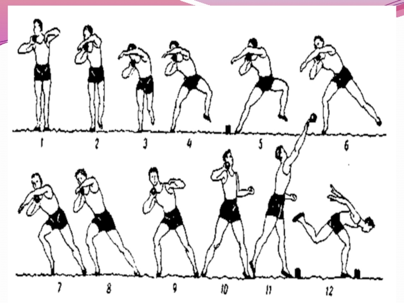 Слайд 12Техника толкания ядра из исходного положения «спиной» к направлению толкания