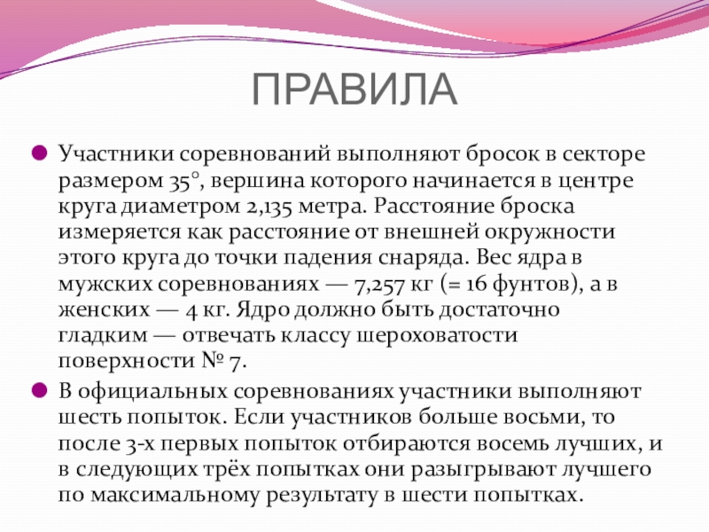 в центре круга диаметром 2,135 метра. Расстояние броска измеряется как расстояние от внешней окружности этого круга до точки падения снаряда. Вес ядра в мужских соревнованиях — 7,257 кг (= 16 фунтов), а в женских — 4 кг. Ядро должно быть достаточно гладким — отвечать классу шероховатости поверхности № 7.