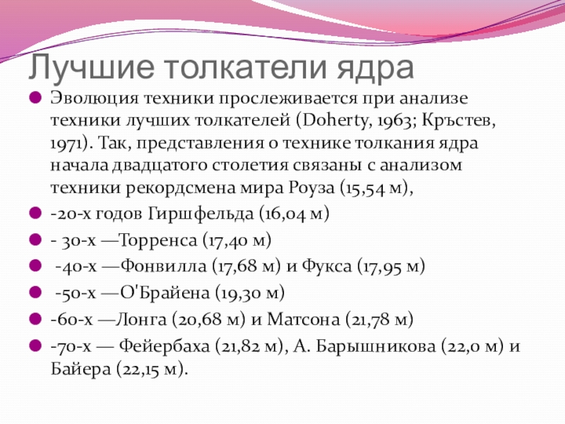 1963; Кръстев, 1971). Так, представления о технике толкания ядра начала двадцатого столетия связаны с анализом техники рекордсмена мира Роуза (15,54 м),