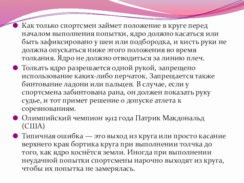 ядра этим способом легкоатлет встает у заднего края круга.