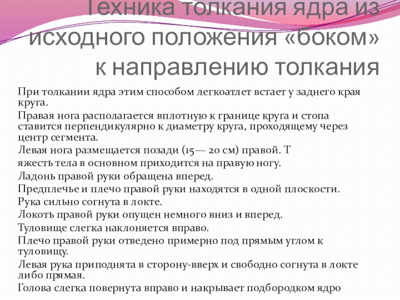 Слайд 8Техника толкания ядра из исходного положения «боком» к направлению толкания