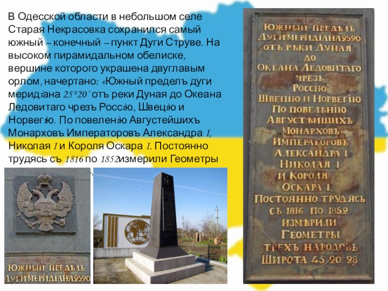 – конечный – пункт Дуги Струве. На высоком пирамидальном обелиске, вершине которого украшена двуглавым орлом, начертано: «Южный пределъ дуги меридiана 25°20´ отъ реки Дуная до Океана Ледовитаго чрезъ Россiю, Швецiю и Норвегiю. По повеленiю Августейшихъ Монарховъ Императоровъ Александра I, Николая I и Короля Оскара I. Постоянно трудясь съ 1816 по 1852измерили Геометры трехъ народовъ».