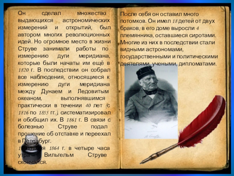 революционных идей. Но огромное место в жизни Струве занимали работы по измерению дуги меридиана, которые были начаты им ещё в 1820 г. В последствии он собрал все наблюдения, относящиеся к измерению дуги меридиана между Дунаем и Ледовитым океаном, выполнявшимся практически в течении 40 лет (с 1816 по 1855 гг.), систематизировал и обобщил их. В 1861 г. В связи с болезнью Струве подал прошение об отставке и переехал в Петербург.