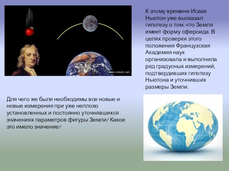 Земля имеет форму сфероида. В целях проверки этого положения Французская Академия наук организовала и выполнила ряд градусных измерений, подтвердивших гипотезу Ньютона и уточнивших размеры Земли.