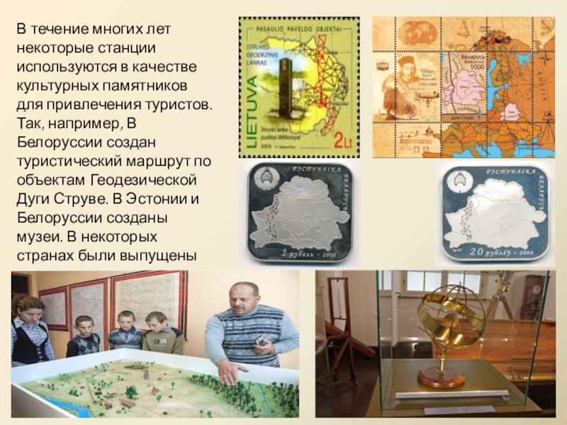 для привлечения туристов. Так, например, В Белоруссии создан туристический маршрут по объектам Геодезической Дуги Струве. В Эстонии и Белоруссии созданы музеи. В некоторых странах были выпущены почтовые сувениры, памятные монеты и прочее.