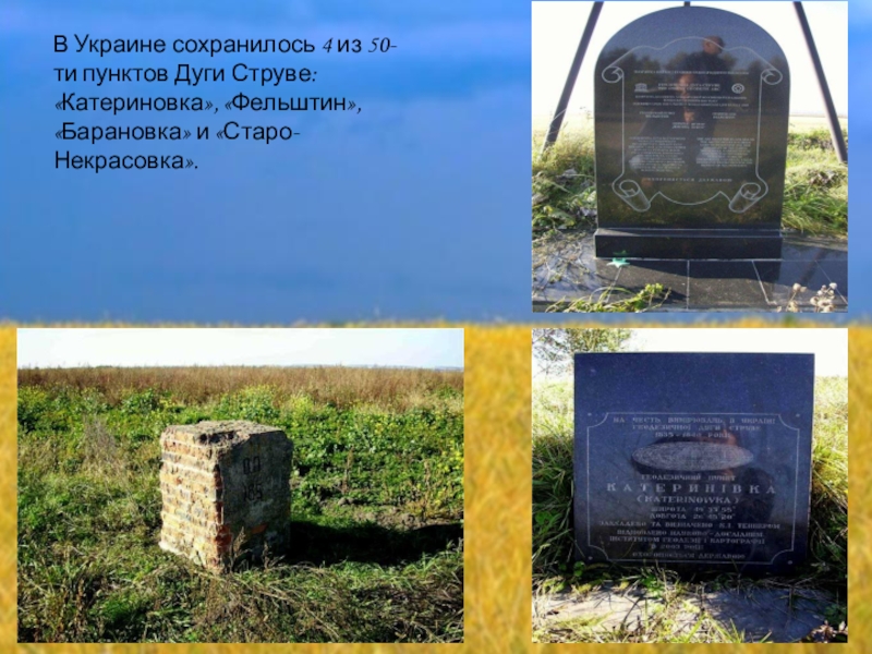 Слайд 24В Украине сохранилось 4 из 50-ти пунктов Дуги Струве: «Катериновка», «Фельштин»,