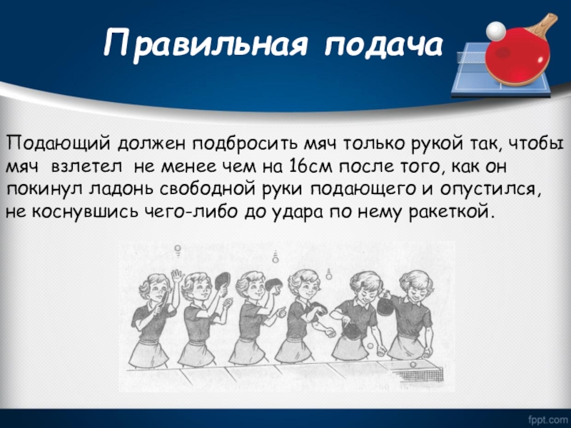 Подающий должен подбросить мяч только рукой так, чтобы мяч взлетел