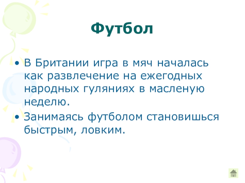 ФутболВ Британии игра в мяч началась как развлечение на ежегодных народных гуляниях в масленую неделю. Занимаясь футболом