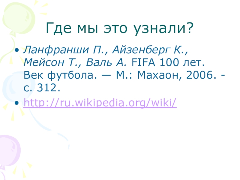 Где мы это узнали?Ланфранши П., Айзенберг К., Мейсон Т., Валь А. FIFA 100 лет. Век футбола. — М.: