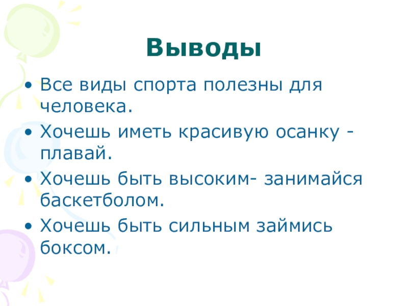 ВыводыВсе виды спорта полезны для человека.Хочешь иметь красивую осанку -плавай.Хочешь быть высоким- занимайся баскетболом.Хочешь быть сильным займись