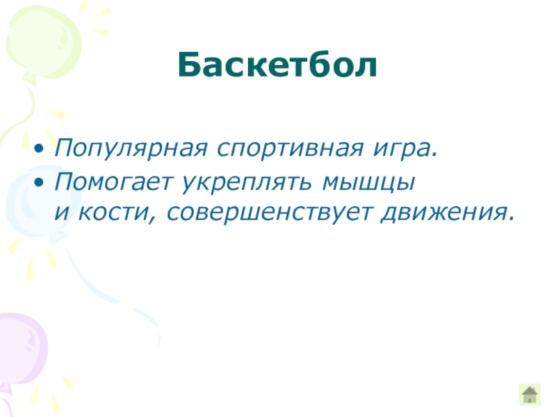 БаскетболПопулярная спортивная игра.Помогает укреплять мышцы  и кости, совершенствует движения.
