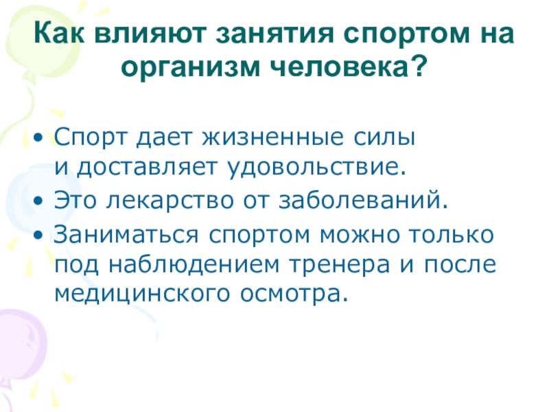 Как влияют занятия спортом на организм человека?Спорт дает жизненные силы  и доставляет удовольствие. Это лекарство от