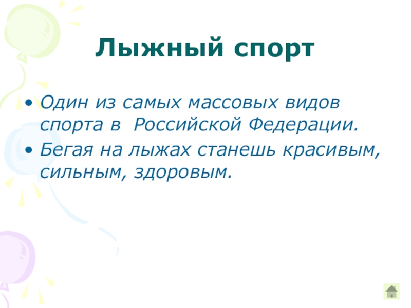 Лыжный спортОдин из самых массовых видов спорта в Российской Федерации. Бегая на лыжах станешь красивым, сильным, здоровым.