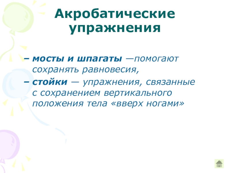 Акробатические упражнениямосты и шпагаты —помогают сохранять равновесия, стойки — упражнения, связанные  с сохранением вертикального положения тела