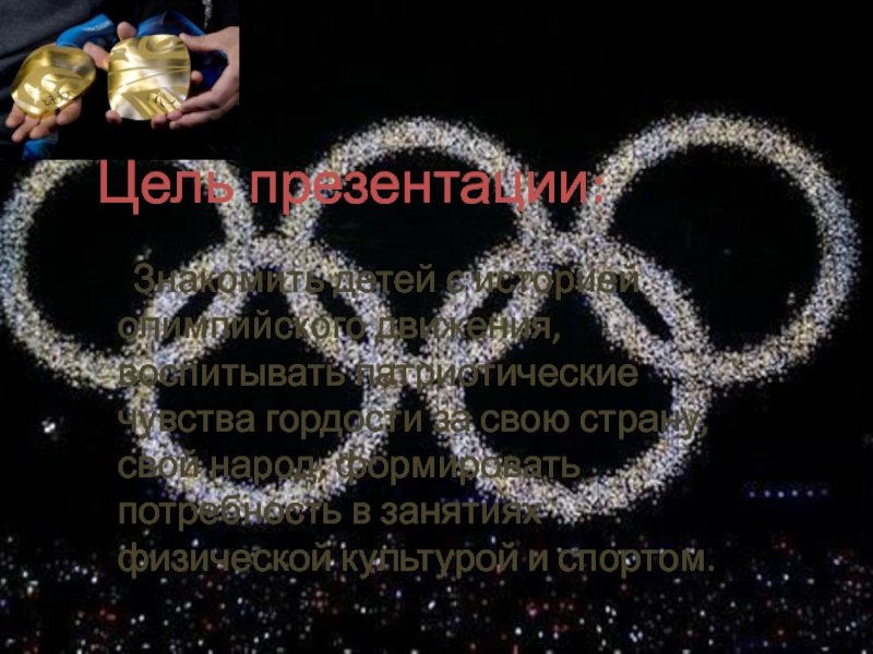 Цель презентации: Знакомить детей с историей олимпийского движения, воспитывать патриотические чувства гордости за свою страну, свой народ,