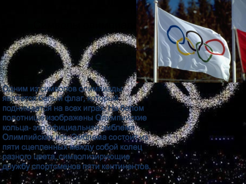 всех играх. На белом полотнище изображены Олимпийские кольца- это официальная эмблема Олимпийских игр. Эмблема состоит из пяти сцепленных между собой колец разного цвета, символизирующие дружбу спортсменов пяти континентов.