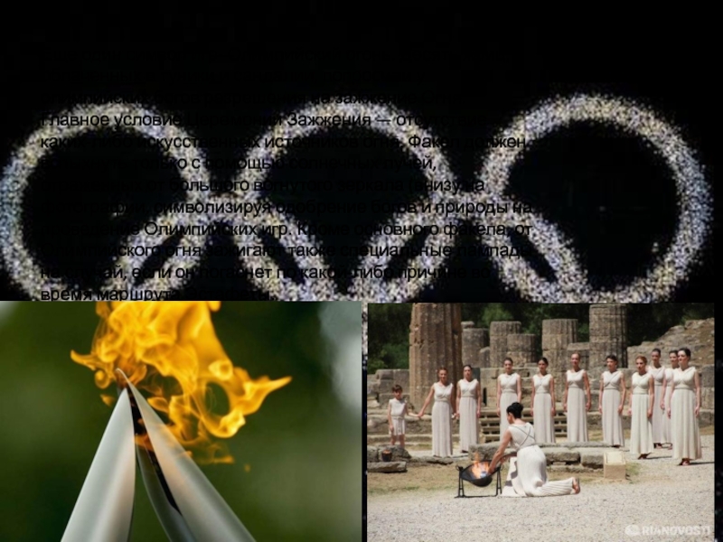 и сандалии, попросили у олимпийских богов разрешения на зажжение Огня. Главное условие Церемонии Зажжения — отсутствие каких-либо искусственных источников огня. Факел должен вспыхнуть только с помощью солнечных лучей, отраженных от большого вогнутого зеркала (внизу на фотографии, символизируя одобрение богов и природы на проведение Олимпийских игр. Кроме основного факела, от Олимпийского огня зажигают также специальные лампады на случай, если он погаснет по какой-либо причине во время маршрута Эстафеты.