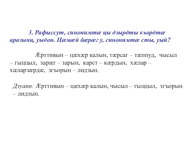Дзуапп: Æрттивын – цæхæр калын, чысыл – гыццыл, згъорын – лидзын.
