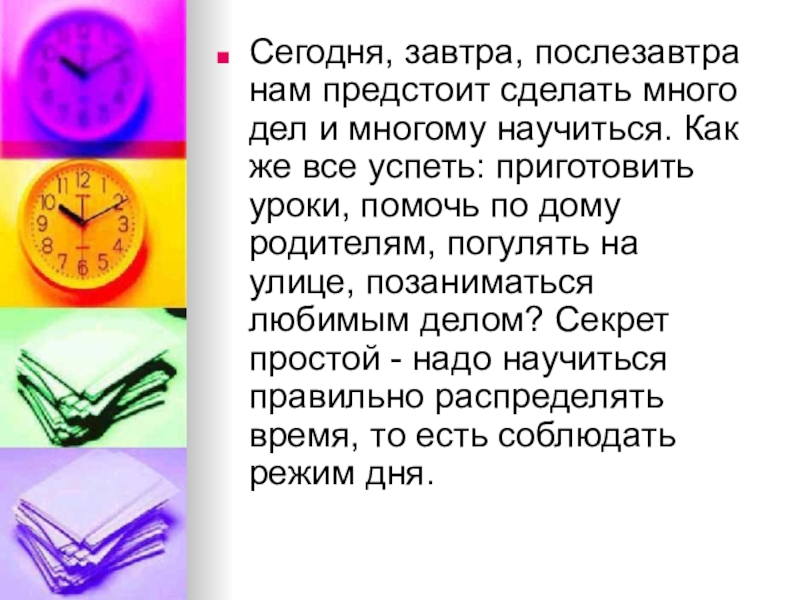 Сегодня, завтра, послезавтра нам предстоит сделать много дел и многому научиться. Как же все успеть: приготовить уроки,