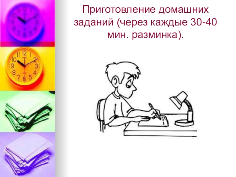 Слайд 14Приготовление домашних заданий (через каждые 30-40 мин. разминка).