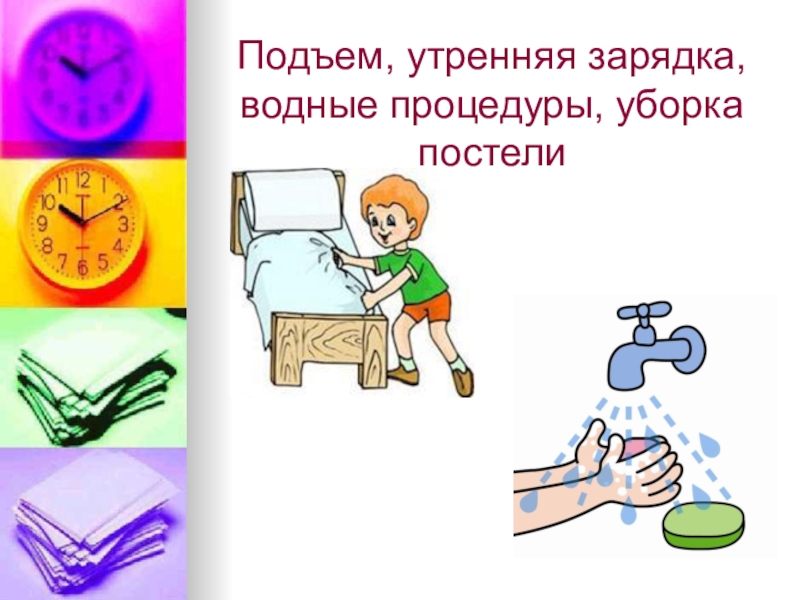 Слайд 7Подъем, утренняя зарядка, водные процедуры, уборка постели
