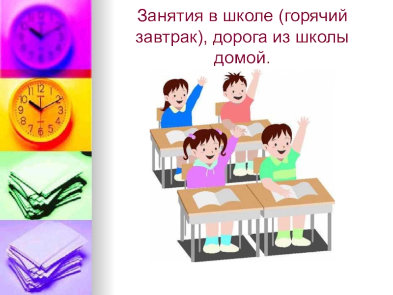 Слайд 10Занятия в школе (горячий завтрак), дорога из школы домой.