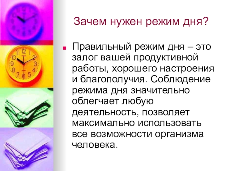 Зачем нужен режим дня?Правильный режим дня – это залог вашей продуктивной работы, хорошего настроения и благополучия. Соблюдение