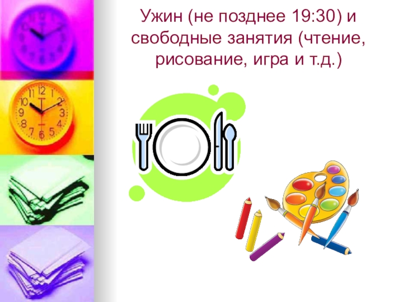 Слайд 15Ужин (не позднее 19:30) и свободные занятия (чтение, рисование, игра и