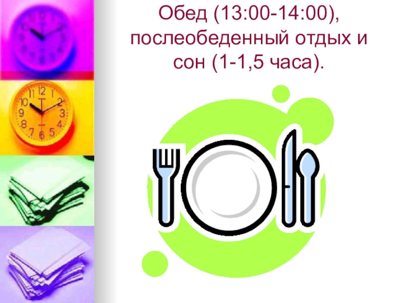 Слайд 11Обед (13:00-14:00), послеобеденный отдых и сон (1-1,5 часа).