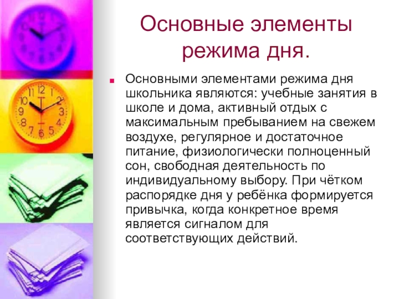 в школе и дома, активный отдых с максимальным пребыванием на свежем воздухе, регулярное и достаточное питание, физиологически полноценный сон, свободная деятельность по индивидуальному выбору. При чётком распорядке дня у ребёнка формируется привычка, когда конкретное время является сигналом для соответствующих действий.
