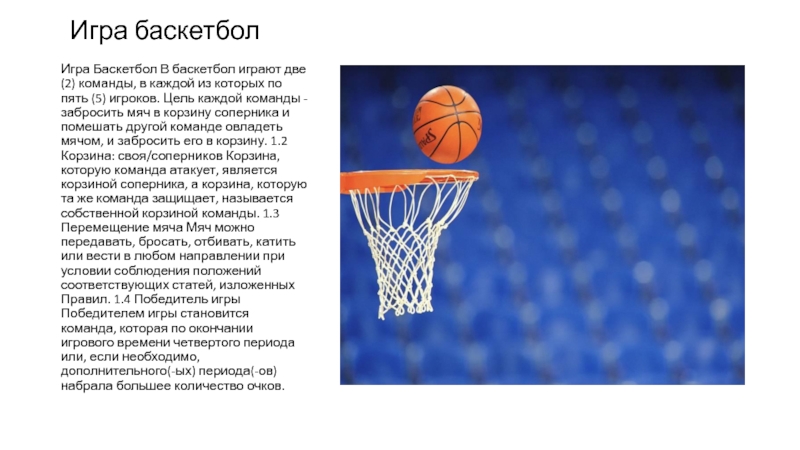 Игра баскетболИгра Баскетбол В баскетбол играют две (2) команды, в каждой из которых по пять (5) игроков.